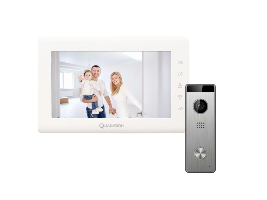 Zestaw startowy: Qualvision QV-IDS4793 Biały wideodomofon i Panel wywoławczy Qualvision QV-ODS235SX w kolorze srebrnym