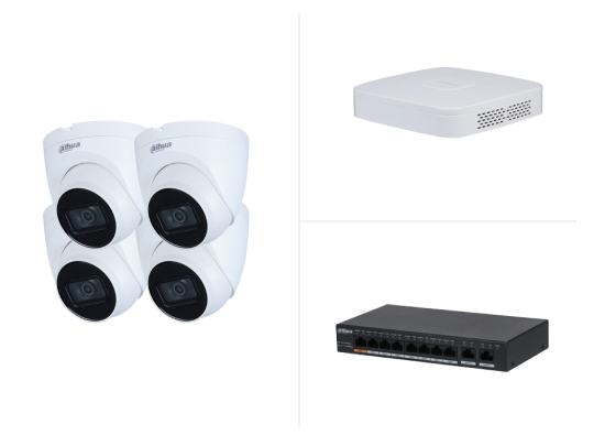 Zestaw dozoru wideo: rejestrator wideo, dysk twardy 1 TB, 4 kamery po 2 MP każda, niezarządzany przełącznik, moc urządzenia.